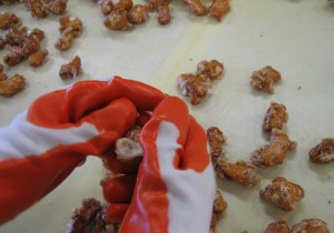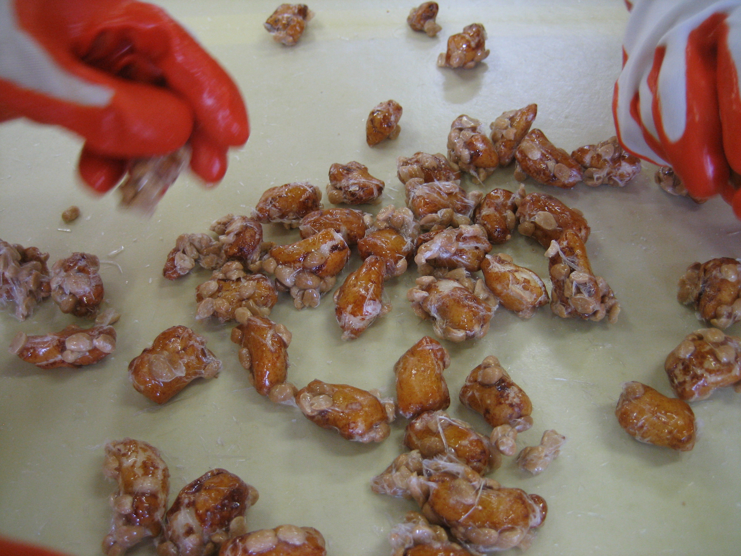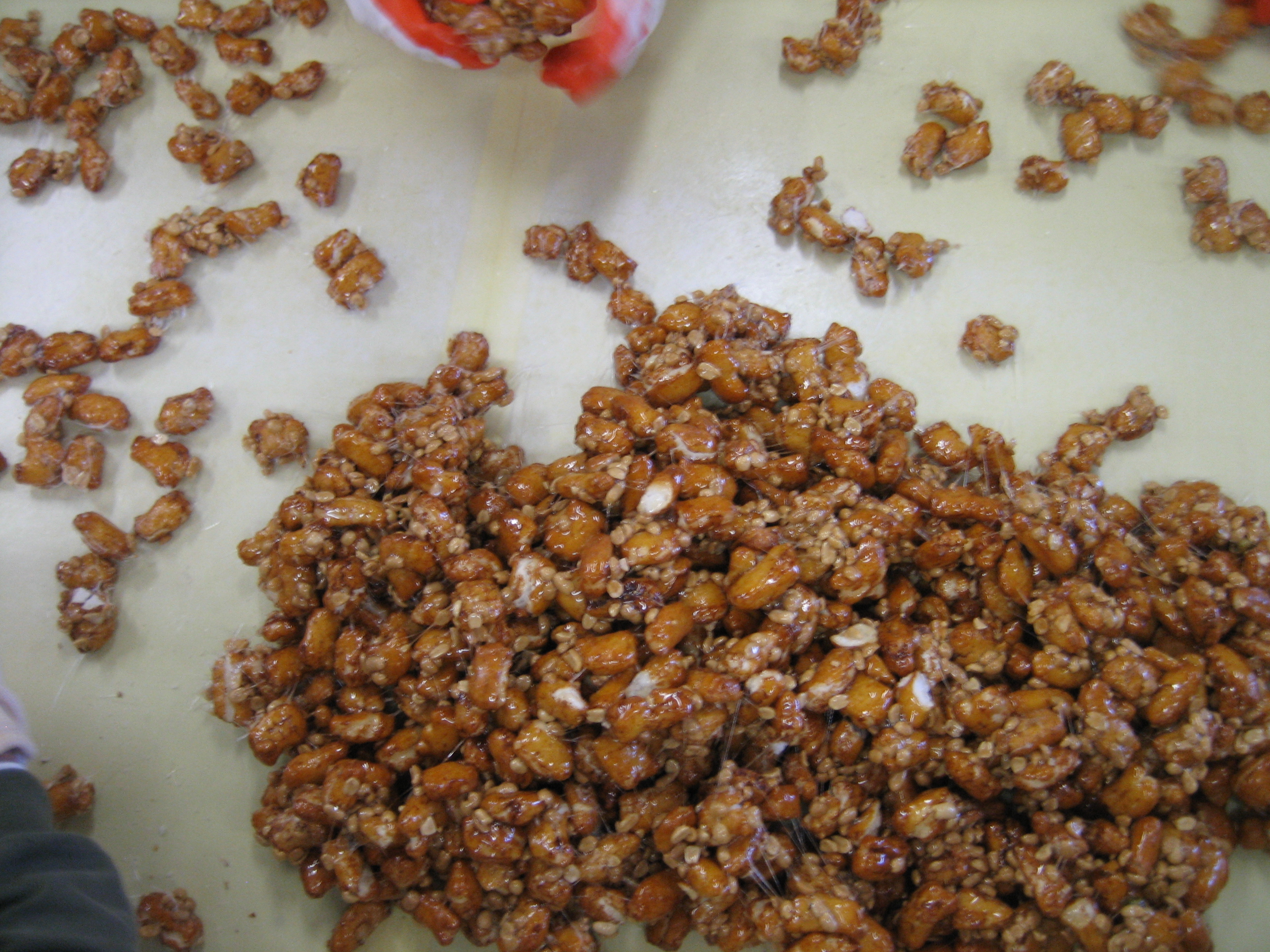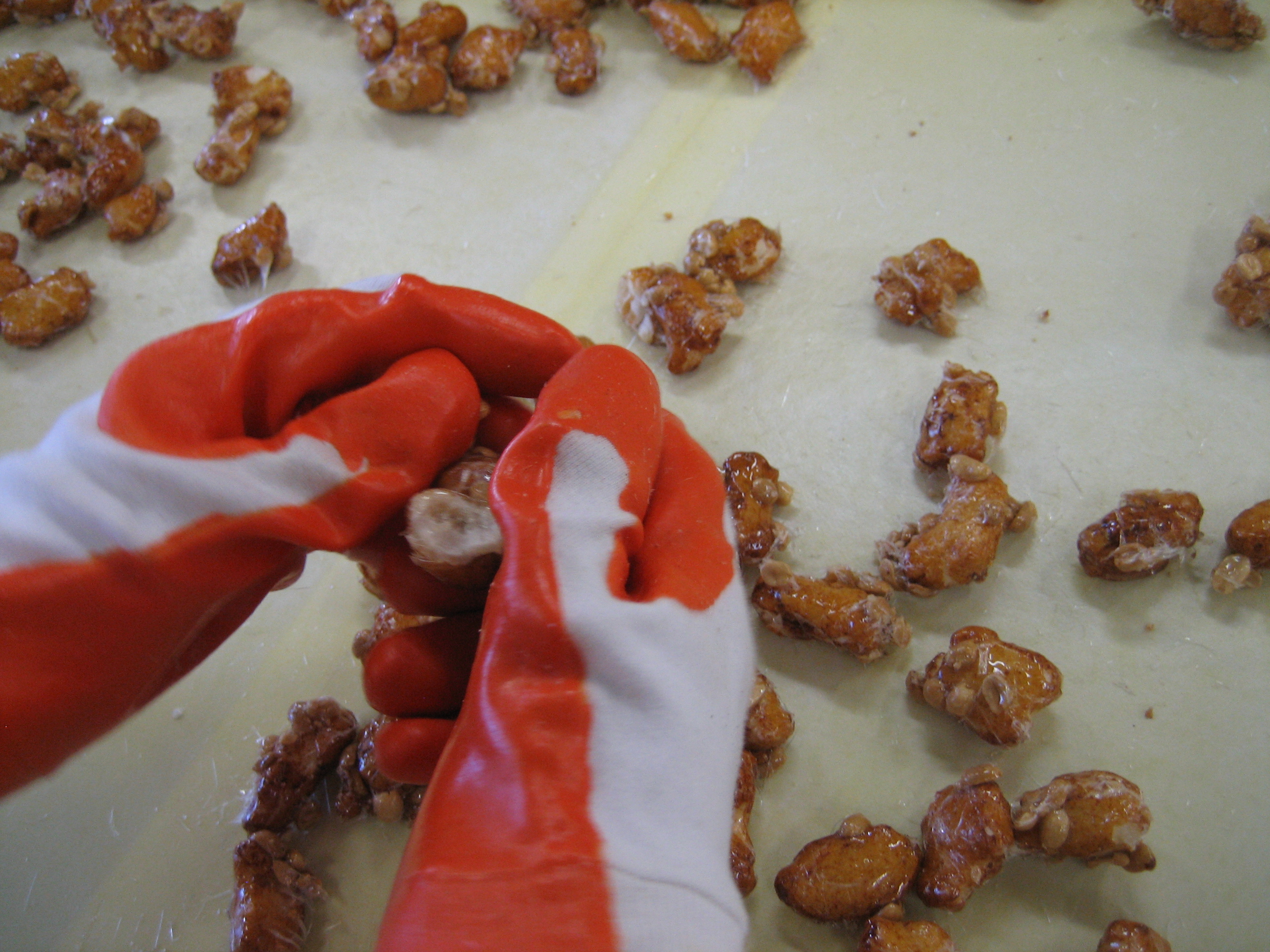丸豆板や割餅ピーナツは あめが絡んだ生地を伸ばしますが